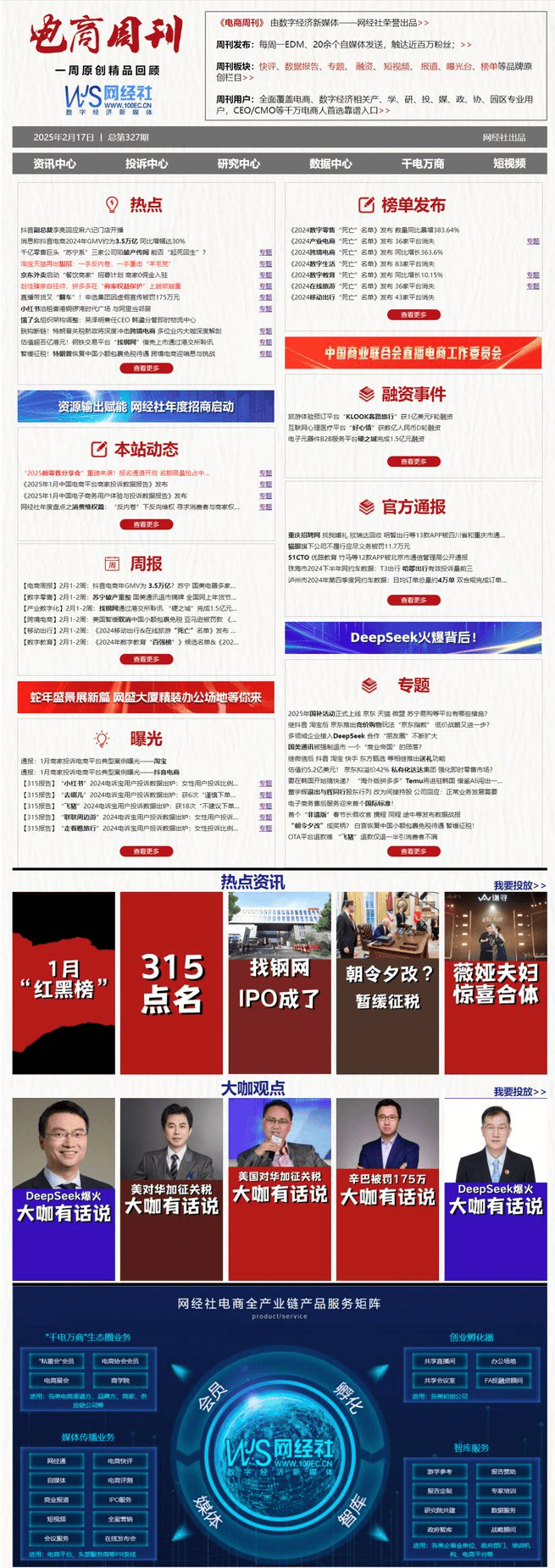 2月5日动静,淘宝天猫面向服饰商家发布新品利好政策。正在新春开工之际,为了更好地帮帮商家搭上“春季上新”的春风,淘宝商家后台将上线“新品超等橱窗”板块,并于2月5日报名入口,每发布成功一个新品,最高可拿3万PV的精准流量。完成新品方针的淘宝商家,最高可拿25万元现金券。2月8日动静,据天猫数据显示,春节假期前三天手机品类成交同比增加超50%。截至目前,共15个省市手机国补勾当全面上线天猫,此中春节期间新增广东、、安徽、陕西4个省市。2月8日动静,阿里妈妈正式推出「2025开年赢新打算」,阿里妈妈万相台版和全坐推广均推出多沉激励政策。商家报名参取2025开年赢新「耗损返」打算及2025开年赢新「全坐推广货物速爆」打算,即无机会获得单店至高50万返点券、商品百元券等激励补助实现开年生意高质增加。2月7日,阿里巴巴集团副总裁颜乔正在伴侣圈对此暗示:“同为中国杭州企业,我们为DeepSeek拍手,可是传播阿里投资DeepSeek的消息是假动静。”2月10日动静,国度补助政策加力,手机、平板、智妙手表等“电子年货”成为本年春节消费新热点。春节头三天,手机品类成交同比增加超50%。截至目前,15个省市手机国补勾当全面上线天猫。2月10日动静,为了营制优良的购物体验,淘宝曲播将调整《淘宝曲播办理法则》曲播间挂品要求,新增“代播要求”前提,未经平台答应不支撑办事费率为0的商品挂入代播曲播间。此次法则变动将于2025年2月19日正式生效。2月10日动静,从岁首年月五到开工第一周,天猫上开运工位粉饰用品同比增加超50%,送来正式开工的年轻职场人把办公桌变成了许愿池,乐高着儿财猫、故宫金桂盆景喷鼻氛、朱炳仁聚宝盆等“祈福办公摆件”热销,年轻人购物车里拆满开工典礼感。2月13日动静,恋人节前夜,淘宝初次推出礼物卡,同品类可跨店利用。淘宝App显示,目前淘宝礼物卡设有美妆护肤卡、母婴亲子卡,面值共有四档,别离为600、800、1000、2000元。2月13日动静,天猫家居行业近日发布开年降佣激励,焦点类目办事费由5%降至2%。按照《天猫家居行业降佣激励法则(2025年2月/3月)》显示,首期从2025年2月1日起至2025年3月31日,合适伙历的商家可报名加入,完成对应方针后即可正在次月获得3%的类目软件办事费降佣激励;激励以等值流量券返还,进一步帮帮商家降低运营成本。据领会,此次天猫降佣政策,估计为家居商家节流上亿元。2月14日动静,南向资金今日净卖出10。24亿港元,盈富基金、腾讯控股、小米集团-W别离遭净卖出31。04亿港元、17。66亿港元、10。27亿港元;阿里巴巴-W逆市获净买入17。28亿港元。2月14日动静,World Governments Summit 2025峰会于2月11日-13日正在迪拜举行。阿里巴凑趣合创始人、董事会蔡崇信出席并颁发,透露了阿里巴巴取苹果公司的最新合做,以及对DeepSeek、人工智能行业成长前景的见地。此外,蔡崇信还回忆了取马云的旧事,还有2023年阿里换帅背后的故事。2月13日,近期马云俄然现身阿里巴巴西溪园区,起首表态闲鱼办公区,向闲鱼的年轻员工们奉上新年问候。马云暗示:闲鱼使用AI手艺的沉点,正在于办事年轻用户体验,让闲鱼成为一条实正“奇异”的鱼,既适配年轻人的糊口体例,更为年轻人创制更多机遇。1月27日,达达集团(Nasdaq:DADA)通知布告称,其董事会已收到大股东京东集团(Nasdaq:JD,于1月25日发出的一份初步非束缚性收购要约。京东建议,以每份美国存托股份(ADS)2。0美元(或每股通俗股0。5美元)的价钱采办达达集团尚未持有的ADS。这一收购报价较达达集团ADS上周五的收盘价1。41美元溢价42%。按此计较,达达集团估值约5。2亿美元。商务部数据显示,本年1月20日至2月1日,已有1470。4万名消费者申请了1886。7万件手机等数码产物购新补助。春节假期不少消费者也来到京东通过国补下单手机、平板、智妙手表做为年货,掀 起春节换新潮。2月10日动静,京东近期正式推出竞价购物弄法“京东指数”,该弄法采用消费者取商家两边配合竞价的模式,构成商品价钱的动态买卖。接近京东的人士透露,这一新弄法正在客岁底已进行过小范畴试运营,近期送来正式上线。拼多多2月6日动静,日前拼多多曾经平台2025年开年元宵节大促、恋人节大促以及开工大促勾当的招商,三场大促将于2月7日00!00顺次连续上线。2月7日,拼多多联系关系公司上海寻梦消息手艺无限公司申请注册多枚“多多剧场”、“多多有好剧”、“多多看剧”商标,国际分类涉及教育文娱、告白发卖、科学仪器等,当前商标形态均为期待本色审查。值得留意的是,2024年9月,该公司还申请注册了多枚“多多短剧”商标。2月11日动静,拼多多将于近期推出“化冻包退”办事。当消费者正在平台内采办带有“化冻包退”办事标识的商品后,正在签收商品24小时内针对化冻商品倡议申请后,商家需要正在24小时内进行无效处置。这意味着,商家取的消费者需要正在后续的处置方案方面告竣分歧。正在陕西省安康市宁陕县一个村庄,这家小店现在有了“新身份”,成了本地村子的多多买菜自提点,每天为本地人供给新颖食材。做为“村中CBD”、消息集散地和快递收发坐,小卖部里堆满了村平易近们下单的年货,从新颖的生果、蔬菜、鱼虾冻货,到必不成少的对联,大年夜饭的酒水饮料,以及走亲访友的一箱箱礼盒,包罗万象。2月6日,抖音电商法则核心更新了调整金和“0元入驻”的新法