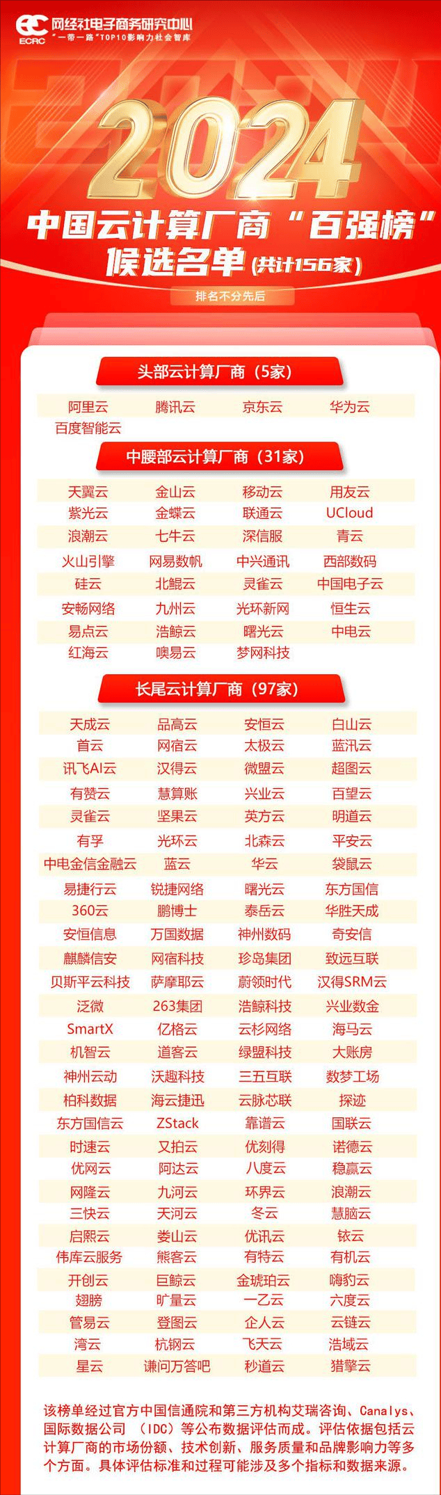 天翼云、金山云、挪动云、用友云、紫光云、金蝶云、联通云、UCloud、海潮云、七牛云、服、青云、火山引擎、网易数帆、中兴通信、西部数码、硅云、北鲲云、灵雀云、中国电子云、安畅收集、九州云、新网、恒生云、易点云、浩鲸云、曙光云、中电云、红海云、噢易云、梦网科技;(3)长尾云计较厂商(97家):天成云、品高云、安恒云、白山云、首云、网宿云、太极云、蓝汛云、讯飞AI云、汉得云、微盟云、超图云、有赞云、慧算账、兴业云、百望云、灵雀云、坚果云、英方云、明道云、有孚、云、北森云、安然云、中电金信金融云、蓝云、华云、袋鼠云、易捷行云、锐捷收集、曙光云、东方国信、360云、鹏博士、泰岳云、华胜天成、安恒消息、万国数据、神州数码、奇安信、麒麟信安、网宿科技、珍岛集团、致远互联、贝斯平云科技、萨摩耶云、蔚领时代、汉得SRM云、泛微、263集团、浩鲸科技、兴业数金、SmartX、亿格云、云杉收集、海马云、机智云、道客云、绿盟科技、大账房、神州云动、沃趣科技、三五互联、数梦工厂、柏科数据、海云捷迅、云脉芯联、探迹、东方国信云、ZStack、靠谱云、国联云、时速云、又拍云、博云、优刻得、诺德云、优网云、阿达云、八度云、稳赢云、网隆云、华数云、易联云、中新云、九河云、环界云、海潮云、三快云、河汉云、冬云、慧脑云、启熙云、娄山云、优讯云、铱云、伟库云办事、熊客云、有特云、无机云、开创云、巨鲸云、金琥珀云、嗨豹云、同党、旷量云、一乙云、六度云、管易云、登图云、企人云、云链云、湾云、杭钢云、云、浩域云、星云、谦问万答吧、秒道云、猎擎云。1688、货捕头、批批网、进货通、采货侠。此前,也曾收到过优市、网商园、中国网库、衣联网、新鬼科技、互坐网、义乌购