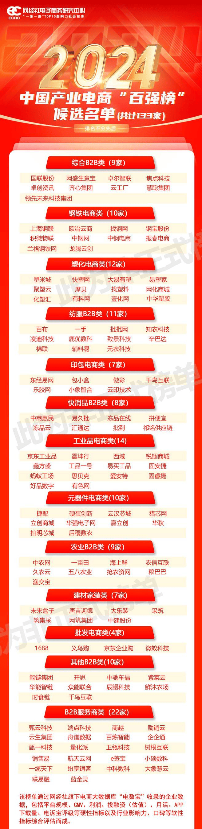 财产电商:狭义指通过第三方及自营B2B平台正在企业间进行的买卖。广义网经社定义为指企业间正在线化的体例进行消息撮合和买卖的贸易模式,是财产互联网的主要构成部门。包罗供给大商品贸换衣务的大电商,供给企业非出产性物料(MRO)及出产性材料(BOM)办事的工业品电商,供给消费品正在线批发的批发电商,供给办公用品、商务办事等的企业采购电商,以及相关办事商等业态。据网经社企业库显示,当前,财产电商财产链中的玩家包罗:(1)分析类:1688、国联股份、网盛生意宝、核心科技、卓尔智联、卓创资讯、齐心集团;1688、义乌购、京东企业购;(3)工业品类:京东工业品、震坤行、西域、锐锢商城、鑫方盛、工品一号、易买工品、固安捷、蚂蚁工厂;捷配、硬蛋立异、云汉芯城、猎芯网、立创商城、华强电子网、嘉立创、华秋、拍明芯城;(5)钢铁电商类:上海钢联、欧冶云商、找钢网、钢宝股份、积微物联、中钢网、中钢电商、报春电商、兰格钢铁网;(6)办事商类:甄云科技、端点科技、商越、励销云、云生集团、舟谱数据、百炼智能、企企通、甄一科技、量化派、卫瓴科技、树根互联、发卖易、航天云网;(7)塑化类:塑米城、快塑网、大易有塑、易塑家、聚塑云;(8)建材家拆类:将来盒子、唐吉诃德、大乐拆、采建、建集采、网建集团;(9)汽车类:新康众、巴图鲁汽配铺、开思、快准车服、甲乙丙丁、三头六臂、中驰车福;(10)农业类:中农网、一亩田、海上鲜、农信互联、久农云、五八农业、抢农资网。【小贴士】据悉,浙江网经社消息科技公司具有17年汗青,做为中国领先的数字经济办事商,供给平台、专业智库以及渠道三大办事,具体办事包罗:1)向平台企业供给:营业为焦点的品牌办事,基于网经社数字经济门户、自矩阵、3000人库;2)向/机构供给:研究征询为焦点的智库办事,基于互联网行业内唯逐个家国度发改委认定的“一带一”TOP10影响力社会智库“网经社电子商务研究核心”;3)向渠道方、商家/创业公司供给多样化的办事:“千电万商”生态圈、网经社投融资核心,包罗私董会、展会、招商会、创业孵化等。