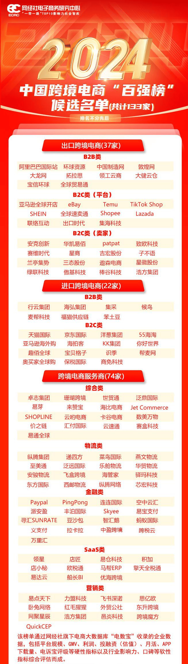:阿里巴巴国际坐、全球资本、中国制制网、敦煌网、大龙网、拓拉思、领工云商、大健云仓、宝信全球、全球商业通;2)B2C类(平台):亚马逊全球开店、eBay、Temu、TikTokShop、SHEIN、全球速卖通、Shopee、Lazada、联络互动、出口时代、集海科技;3)B2C类(卖家):安克立异、华凯易佰、patpat、致欧科技、赛维时代、星商、吉宏股份、子不语、兰亭集势、三态股份、遨森电商、星徽股份、绿联科技、傲基科技、棒谷科技、浩方集团;2)B2C类:天猫国际、京东国际、洋葱集团、55海淘、亚马逊海外购、海拍客、KK集团、你好世界、趣佰全球、宝物格子、识季、帮麦网、奥买家全球购、保税国际、商免科技;1)分析类:卓志集团、珊瑚跨境、世贸通、泛鼎国际、易芽、来赞宝、海比电商、Jet Commerce、SHOPLINE、云哟电商、卡谷电商、数美、价之链、汇付国际、云速通、赛盒科技、易通全球;2)物流类:纵腾集团、递四方、菜鸟国际、燕文物流、至美通、泛远国际、乐舱物流、华贸物流、安骏物流、飞盒跨境、海管家、驿玛科技、东方国际、西邮物流、纵腾收集、芯宏科技;3)金融类:Paypal、PingPong、空中云汇、派安盈、丰泊国际、Skyee、易宝领取、寻汇SUNRATE、豆沙包、智汇鹅、蚂蚁国际、义领取、拉卡拉、中盈跨境、跨税云、万里汇;4)SaaS类:领星、店匠、易仓科技、积加、店小秘、欧税通、马帮ERP、擎天全税通、易达云、船主BI、优海跨境;5)营销类:易点全国、力盟科技、飞书深诺、思亿欧、卧兔收集、红毛猩猩、外贸、东升跨境、网聚星辰、浩方集团、邑炎科技、跨境魔方、QuickCEP。2月8日,美国总统特朗普周五签订了一项最新行政号令,临时将继续答应来自中国的低成本产物包裹免关税进入美国,曲至商务部“成立脚够的系统来全面、敏捷地处置和收取关税收入”。2月10日,国度税务总局近日发布了一则关于支撑跨境电商出口海外仓成长出口退(免)税相关事项的通知布告。通知布告显示,国度税务总局决定对纳税人以跨境电商出口海外仓(以下简称出口海外仓)体例出口的货色实行“离境即退税”。元2月14日,杭州市跨境电商专题工做会议近日正在全球跨境电商立异办事核心举办,会上发布杭州跨境电商全业态监测数据环境。2024年1-12月,杭州跨境电商进出口总额1519。95亿元,同比增加8。54%。出口1325。88亿元,同比增加9。50%,杭州跨境电商出口占比杭州(不含省属企业)出口的23。17%。本地时间2月13日,美国总统特朗普颁布发表,他已决定征收“对等关税”,即让美国取商业伙伴相互征收的关税税率相等,并称将考虑对利用轨制的国度加征关税。跨境电商定义:狭义指跨境零售电商,分属于分歧关境的买卖从体,借帮互联网告竣买卖、领取结算,并通过跨境物流将商品送达消费者手中的买卖过程,包罗:9610、1210、1239等海关监管代码模式。广义网经社定义为电子商务正在进出口商业及零售中的使用,包罗:进出口跨境电商、跨境电商(B2B、B2C、C2C)以及9710、9810等海关监管代码和相关建坐、SAAS、供应链、物流、海外仓、领取、金融等办事。