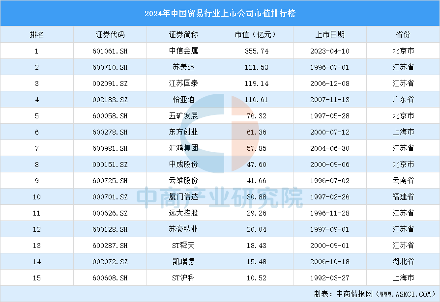 中商谍报网讯:中商财产研究院数据库显示,2024年中国商业行业市值最大的十名上市公司别离是中信金属、苏美达、江苏国泰、怡亚通、五矿成长、东方创业、中成股份、云维股份和厦门信达。